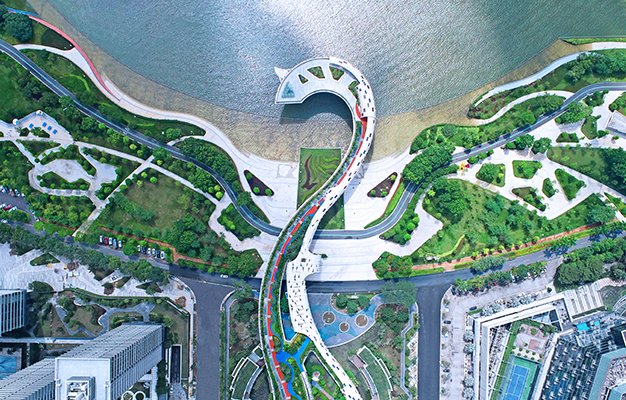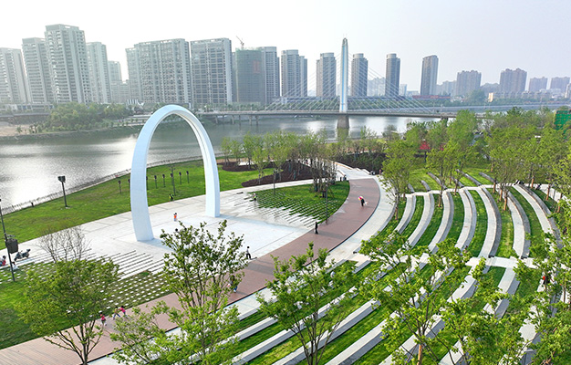 从“凤城”中获取设计灵感,提炼凤凰的“展翅”形象作为滨河绿地的标志设计元素,将设计主题定为“振翅腾飞,舞动凤城”,寓意把顺德这块风水宝地的吉祥美好祝福传遍全中国,带给全世界,同时预示着顺德经济、文化、体育等各方面将进入一个更具活力与蓬勃生命力的时代。