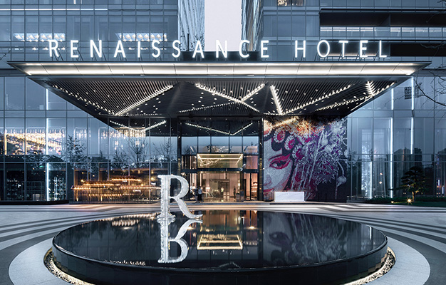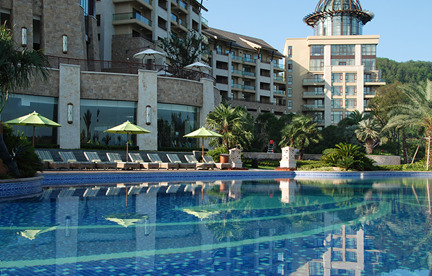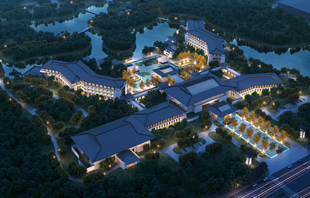 杭州千岛湖希尔顿酒店依陡峭的山体,临湖而建。湖水随着季节的更替,水位相差数十米左右。在建筑规划中,由七座楼宇形成一个整体,其间楼宇的朝向与功能都不一样,而且酒店的大堂入口面山而建,山体的竖向结合景观的竖向进行考虑,亦减少对山体的破坏。较陡峭的区域设计了亲水的草坡,比较平缓的区域设计了梯级的草阶,多处山体地形亦按景观的建议进行修整。