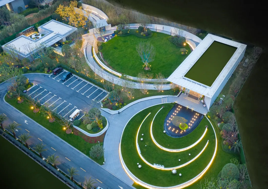 示范区面积9000平方米,场地平整,建筑以白色金属与玻璃的交融为主,简洁大方。设计将售楼中心建筑抬高3.5米,形成仰望的视觉效果。