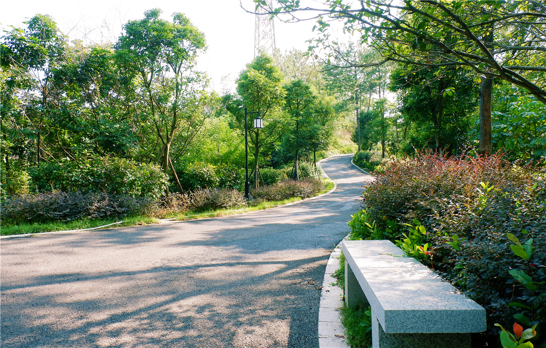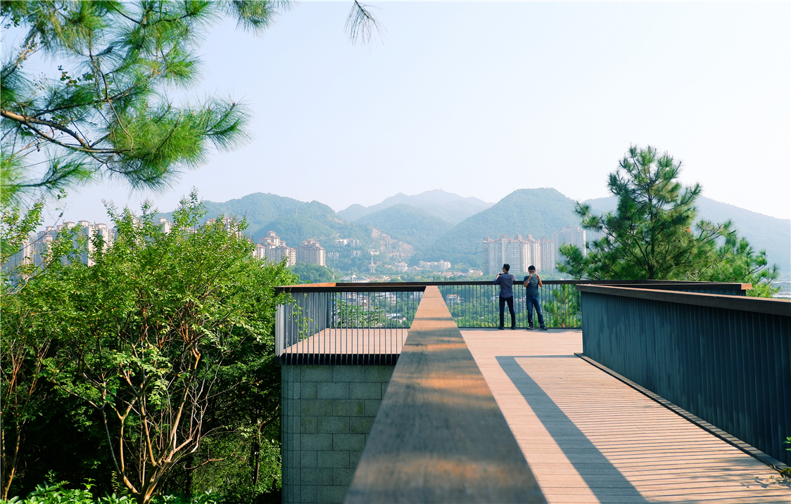 围绕山体建造登山游览道路,丰富道路两旁植物,改善原有以松林为主的单调绿化景观,增加补充高大常绿乔木,并进行林下植被景观营造,让山体四季都呈现出郁郁葱葱的景观,沿途设置观景挑台和休憩设施,为人们提供了运动休闲的好去处。沿途设置的景观木平台成为游客爬山过程中休息远眺的停留地,凉风习习,美景与游人互相映衬。