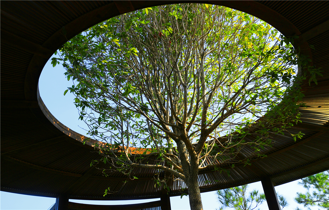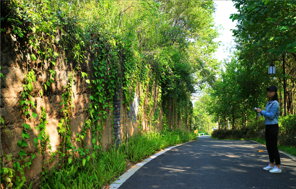 尊重场地历史记忆,保留场地原有的围墙并对其进行景观更新,补充绿色爬藤植物,使之融入沿途登山道路景观之中,产生绿影斑驳的效果。