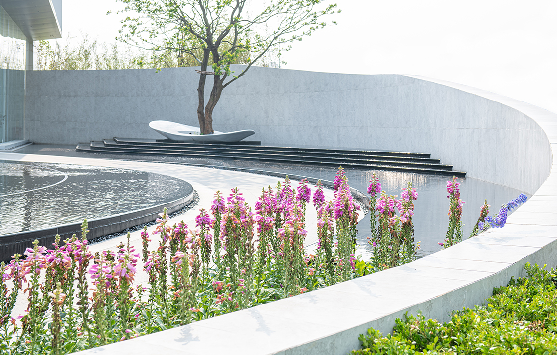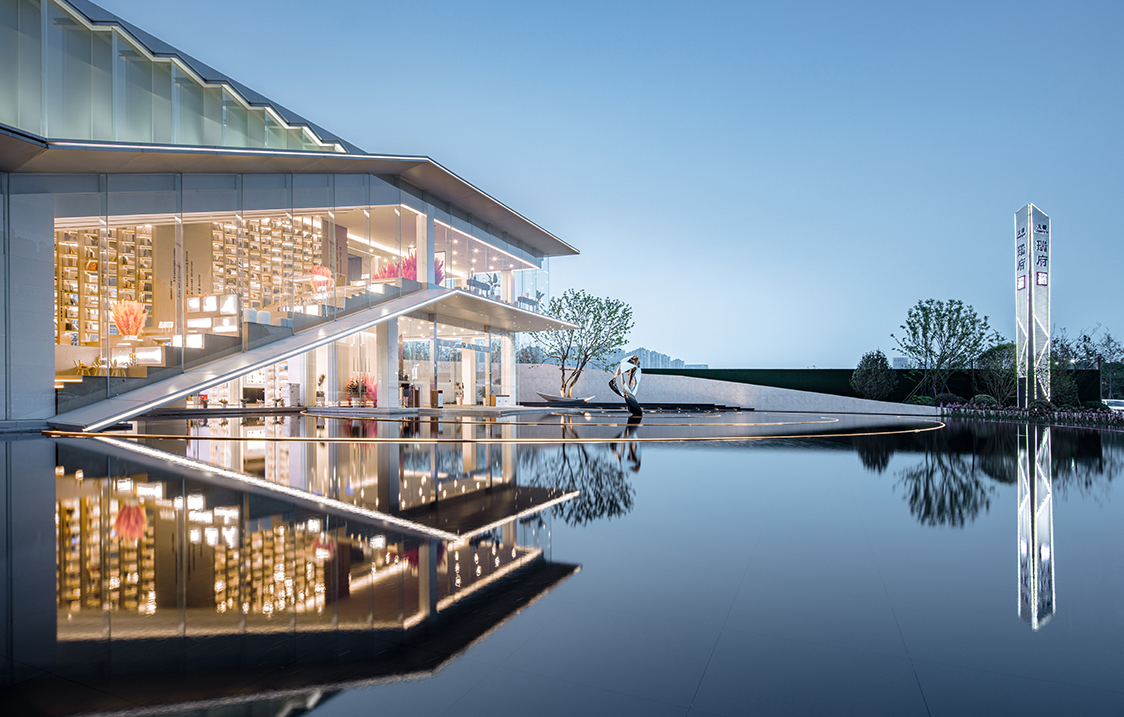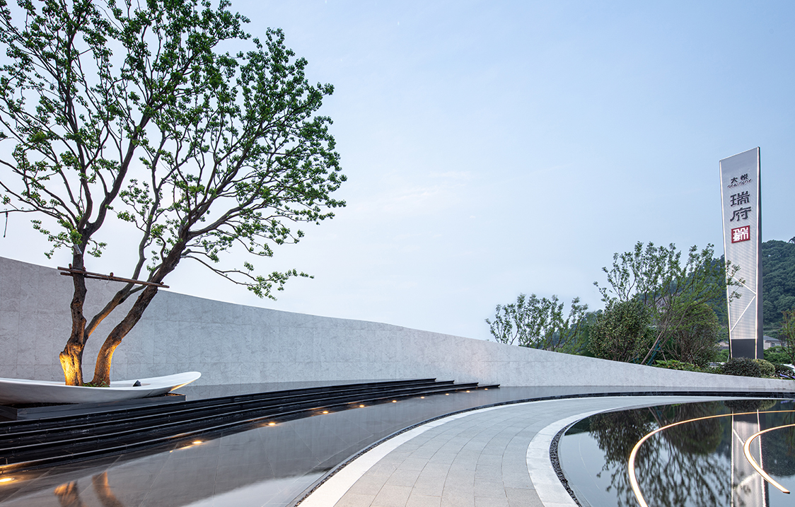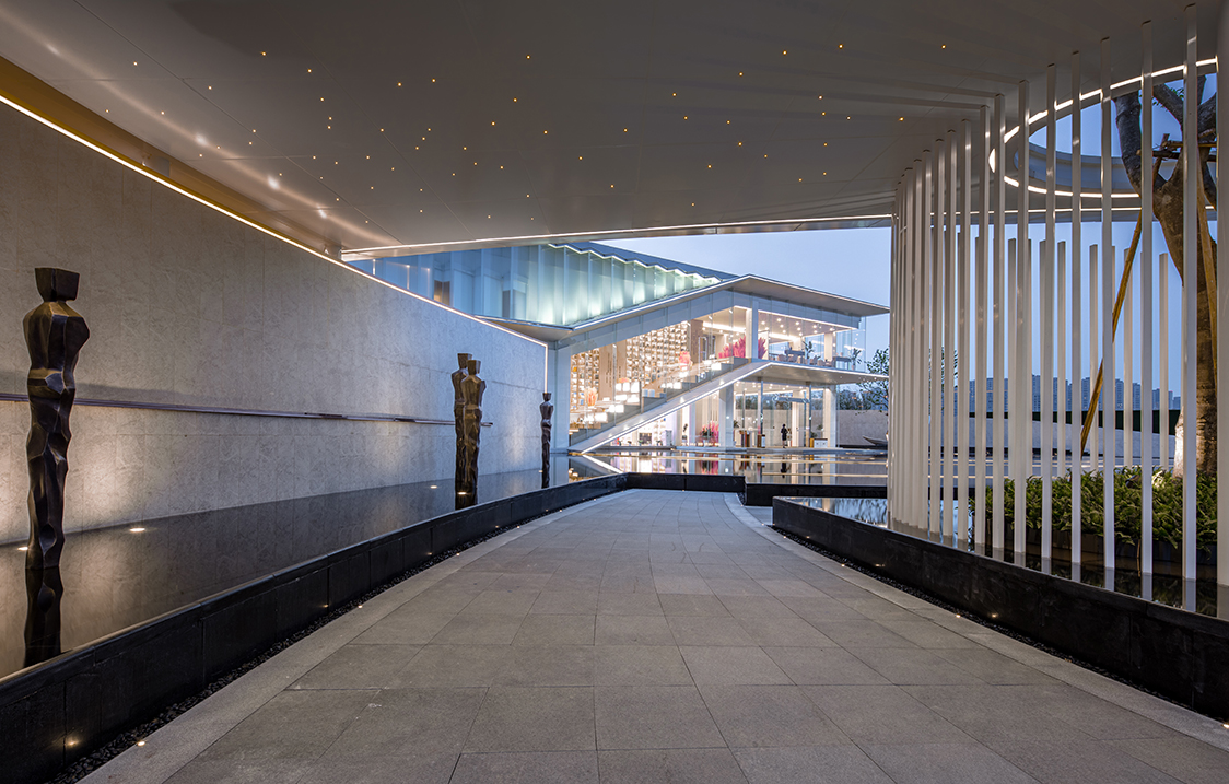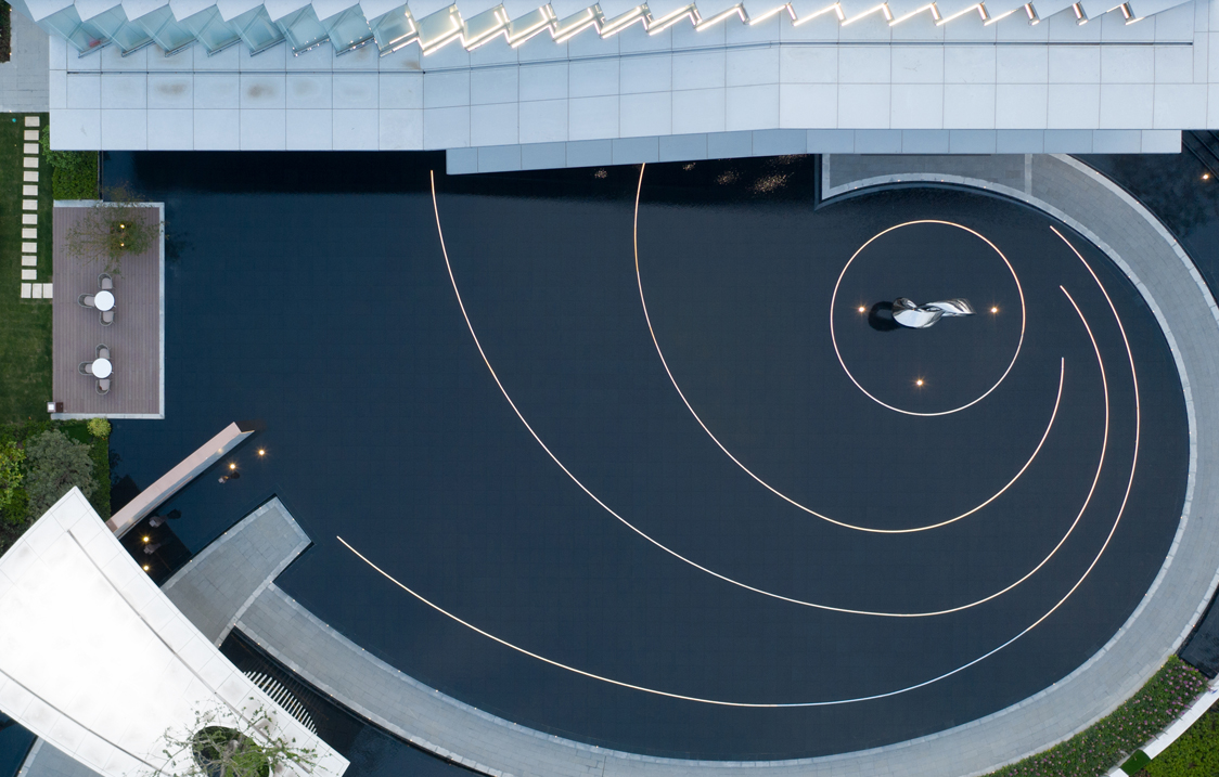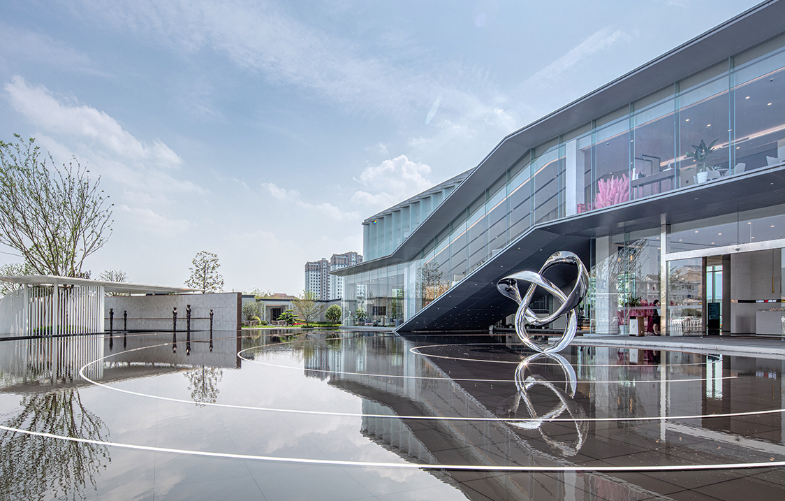 设计以中国传统文化哲学的“道”为理念,将宇宙万物的本源,循环往复、生生不息的“道”融贯其中,以旋转的宇宙星系为构图原型,通过现代简约的设计手法运用向心旋转的构图方式,表达一种循环的宇宙观。 整个展示空间以“天空之境”为设计主题,以“镜”字为原型散发,根据场地特性,分干净、安静、镜像、恭敬和意境作为五大空间主题。各个空间彼此渗透,相互流通,界面组织具有连续性和节奏性,在空间的不断转化间,于光影交错中感受一场静心之旅。