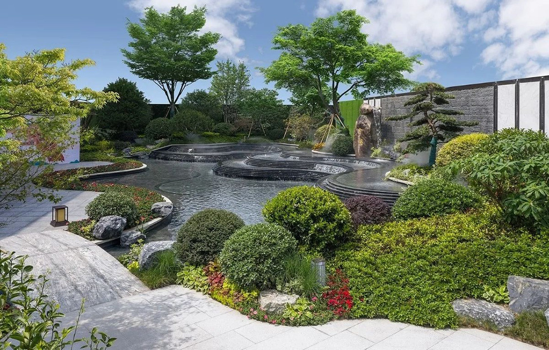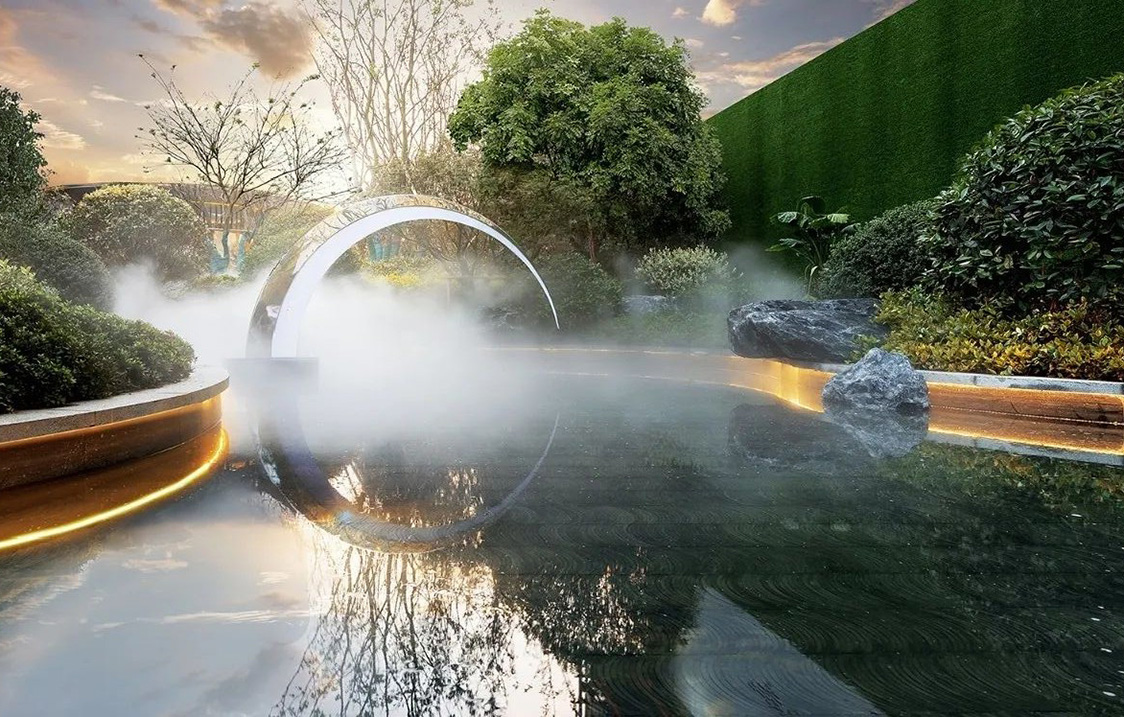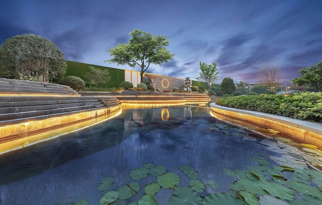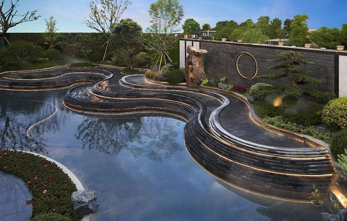 设计将场地展开形成一幅山水内容,如江南画卷跃然于纸上,将传统山水绘画要素、技巧及江南特有的自然风情融入场地设计中,打造“涧沙流水春自香,石楠碎叶秋如扫缚柴野桥松雨凉,鸣钟破寺茶烟杳。”的园林意境。