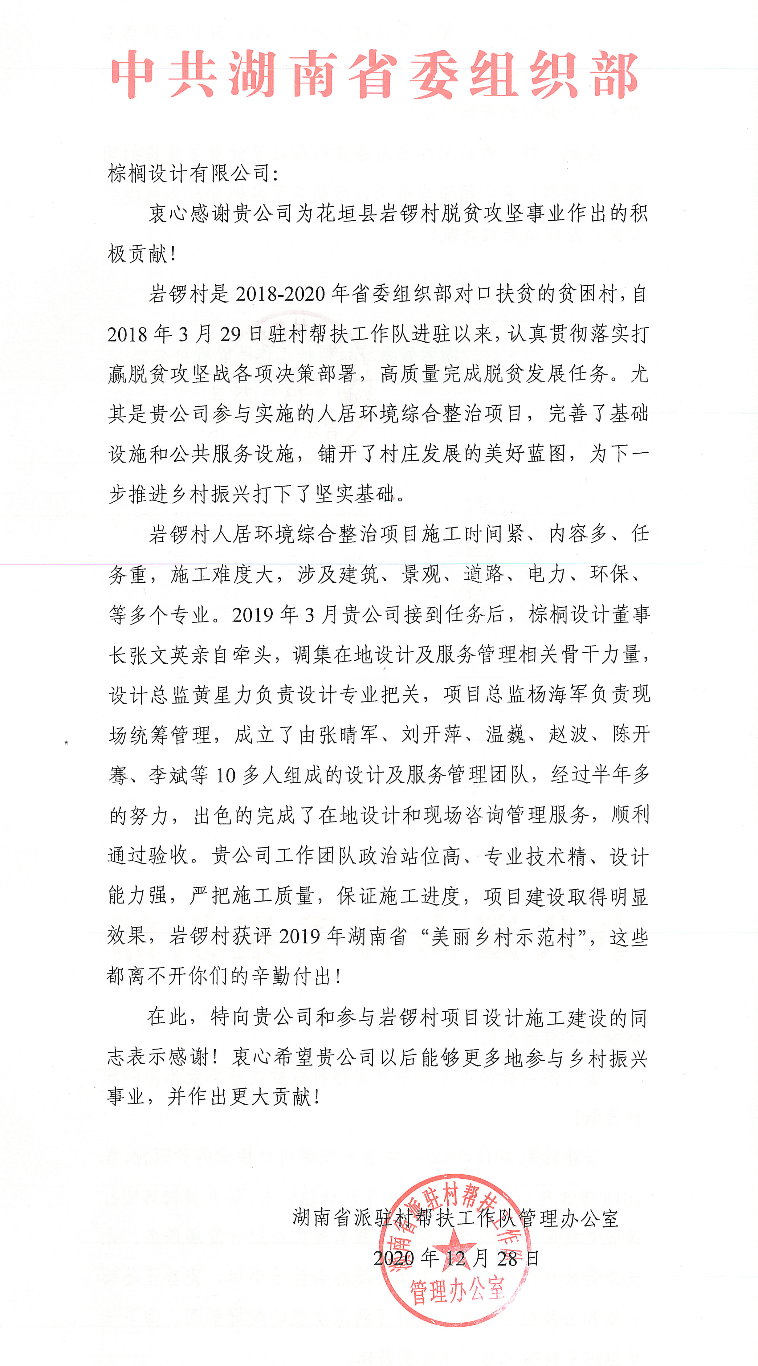 棕榈集团积极响应国家乡村振兴战略,承担起岩锣村的建设任务,完成设计施工一体化。各组织部门积极推进,省委组织部、花垣县、双龙镇、棕榈集团都派出驻村负责人,确保工程建设的顺利进行。湖南花垣县岩锣村获评“2019年度湖南省美丽乡村建设示范村”,中共湖南省委组织部也给我们送来了一封特别的感谢信。