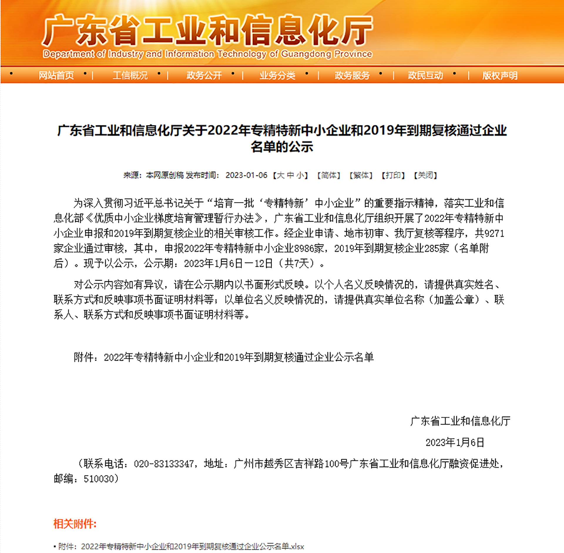 2023年1月6日,广东省工业和信息化厅发布《广东省工业和信息化厅关于2022年专精特新中小企业和2019年到期复核通过企业名单的公示》。