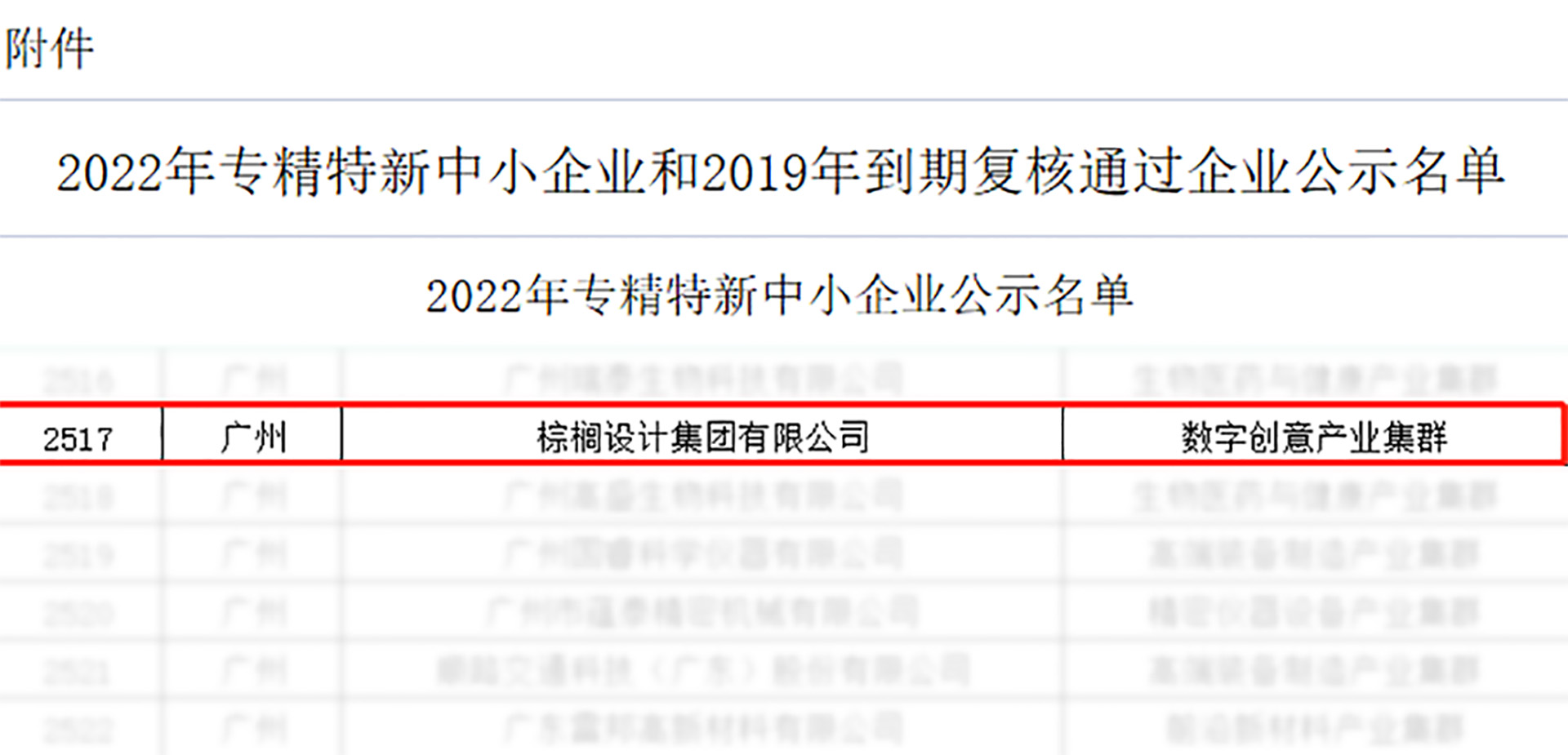 经过企业自主申报、地市工业和信息化主管部门推荐、专家评审和网上公示等程序,棕榈设计集团凭借过硬的研发和创新等实力优势,从15730家广东省创新型中小企业中脱颖而出,荣获2022年“广东省专精特新中小企业”认定。