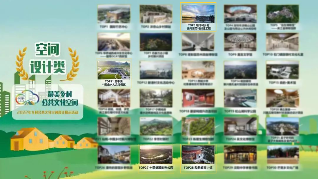 棕榈设计作品《塘湾村乡村振兴示范村创建工程》获“最美乡村文化空间(空间设计类)TOP3”;《三千漓中国山水人文度假区》获“最美乡村文化空间(空间设计类)TOP11”;《十里槠溪时光公园》获“最美乡村文化空间(空间设计类)TOP27”;《和君教育小镇》获“最美乡村文化空间(空间设计类)TOP28”。棕榈设计荣获“最佳设计/运营机构TOP10”称号