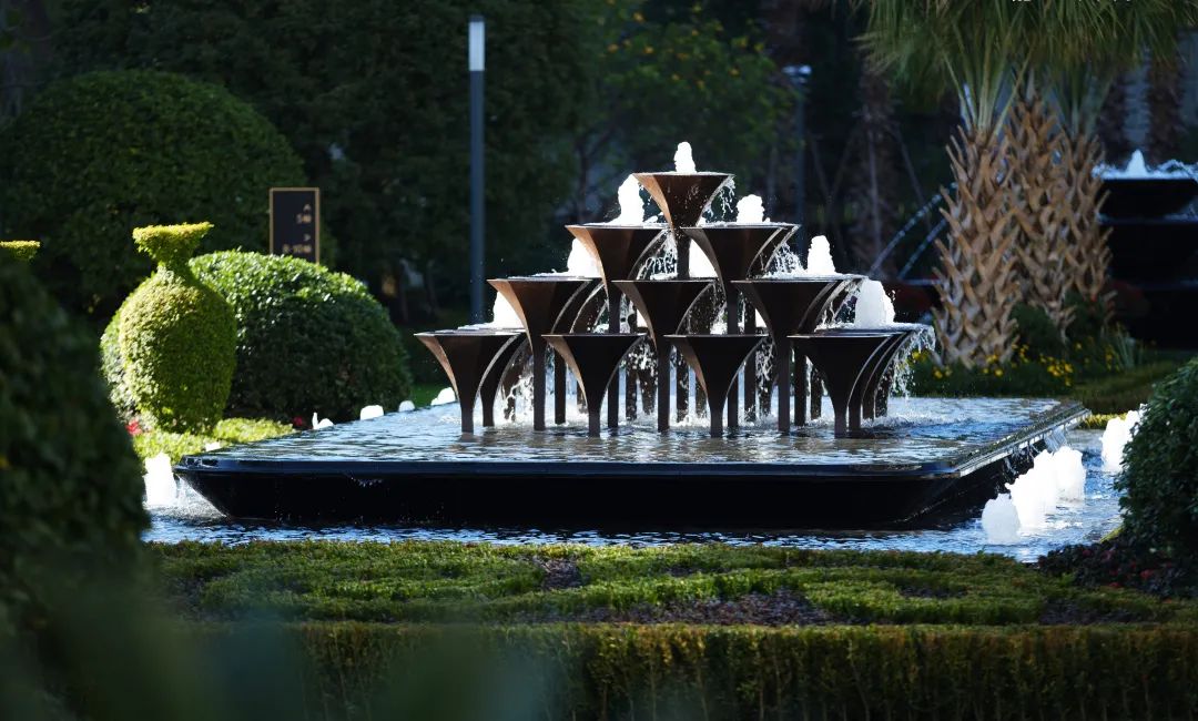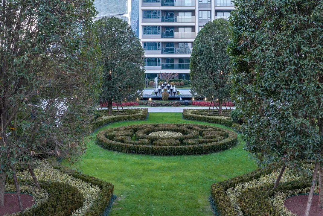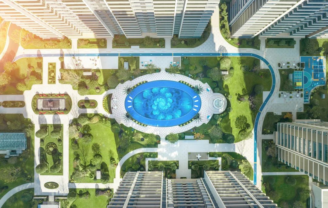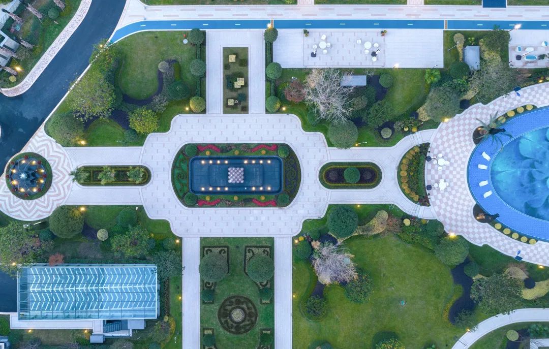 整体以浪漫主义设计手法凸显典雅艺术风格,超百米的景观轴线与宝格丽风情喷泉向浪漫致敬,宝蓝色古典泳池结合异域风情的模纹植物组团,不断演绎着繁华掩映,寻梦庄园的生活故事情节。
